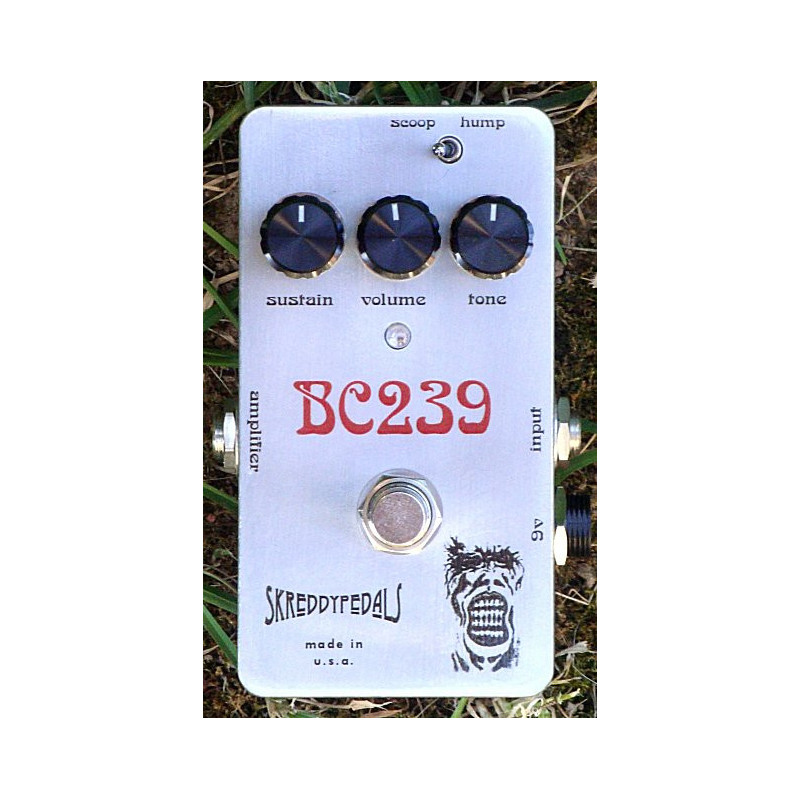 La Skreddy Pedals BC239 FUZZ est un retour à la fin de l'ère « rams head ». Le transistor BC239 aura tendance à rendre moins de basses, ce qui donne un son de sourdine plus mordant et articulé. Ajoutez à cela le fait que les dernières rams head utilisaient des condensateurs à film plastique au lieu des disques en céramique au son plus doux et plus granuleux utilisés dans les boutons triangulaires et les premières rams head, et vous obtiendrez un haut de gamme clair et tranchant. Vous entendrez chaque détail de sa distorsion veloutée. Je préserve l'articulation en contrôlant le gain juste assez et en ne le laissant pas devenir trop mou ou sirupeux. Le son est agréable et chaud, avec de nombreuses harmoniques et, bien sûr, un grand sustain. Plutôt qu'un son rond et flasque, vous obtiendrez un grain charnu même dans les notes aiguës.