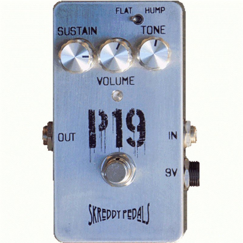 La P19 dispose d'une véritable commutation de bypass et fonctionne sur pile 9V ou sur adaptateur de type Boss, le tout logé dans un châssis de style MXR. En plus des contrôles familiers de tonalité, de gain et de volume, il y a un mini interrupteur à bascule permettant de basculer entre un son plat non coloré et une légère bosse dans les médiums."